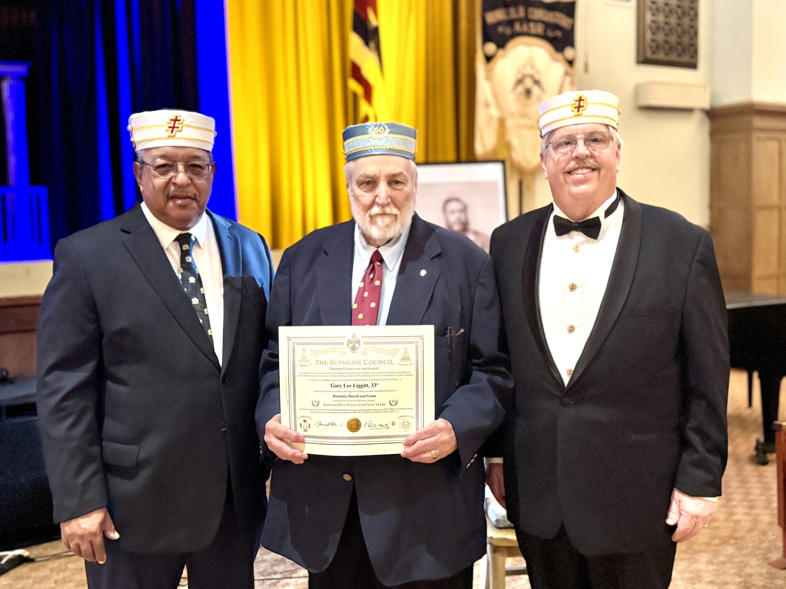 The Honolulu Scottish Rite takes great pride in honoring Brethren whose lives reflect the values of our Order. Illustrious Gary L. Liggitt’s 50 years of service stand as an inspiration to us all, reminding us that the true strength of the Rite lies in the character and constancy of its members.